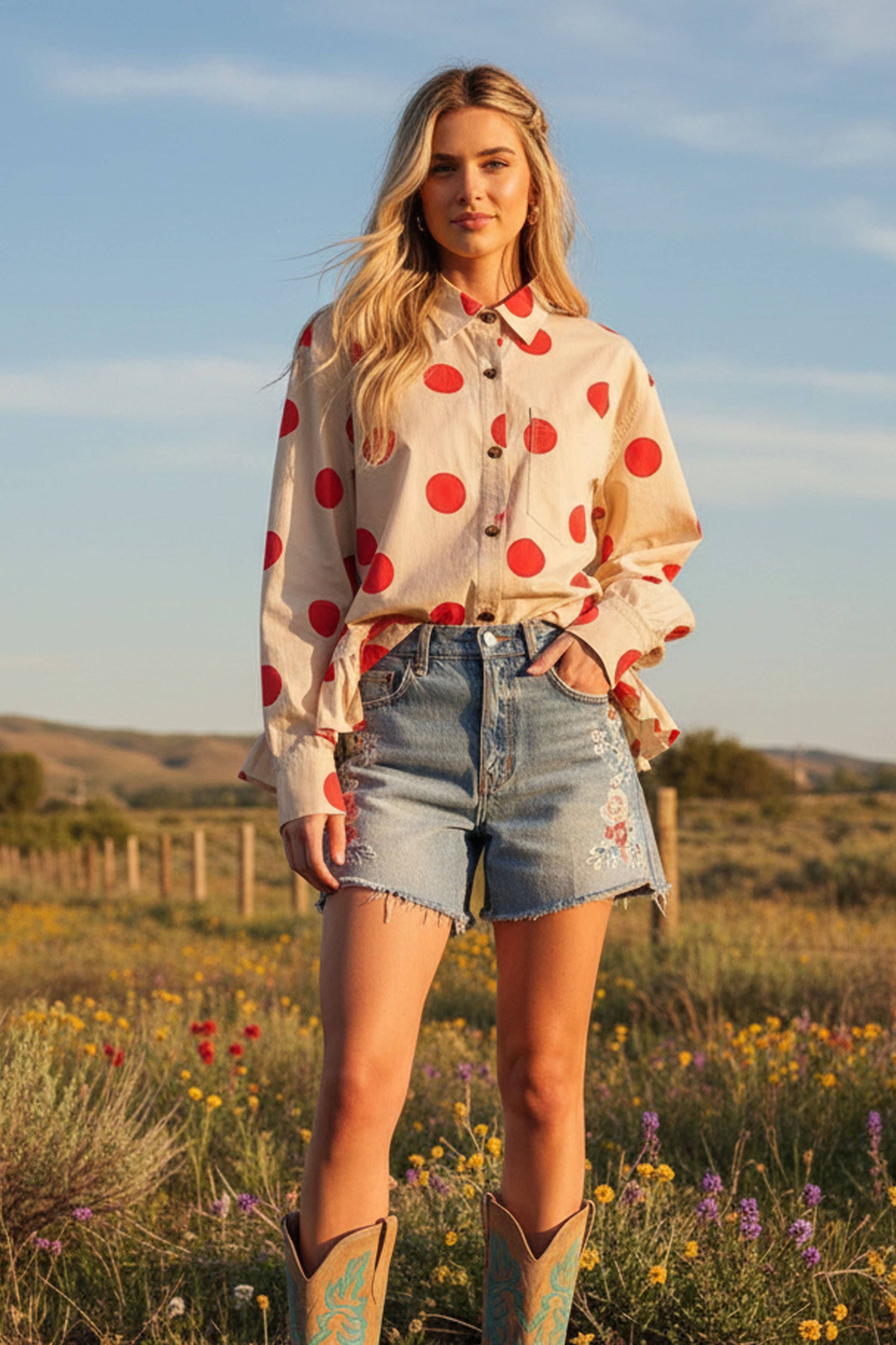 A playful button-down shirt featuring bold black polka dots on a neutral background. Designed with a relaxed fit, single chest pocket, and a flirty ruffle hem for added movement. Perfect for casual days, weekend outings, or layering with your favorite denim.polka dot shirt, ruffle hem top, button down blouse, playful casual top, oversized polka shirt, long sleeve ruffle blouse, weekend casual wear, Sewn and Seen, gameday, game day